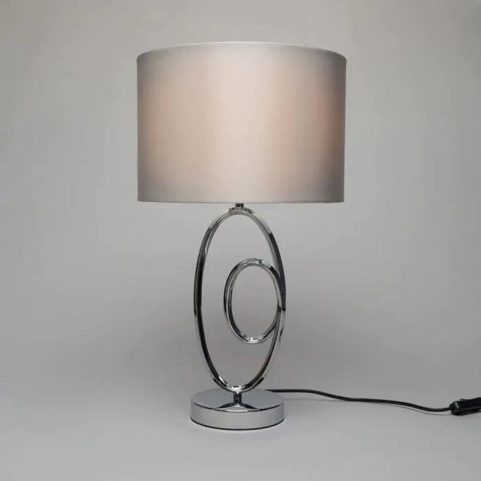 The Aspen Sculptural Table Lamps Lamp gives the home a smooth, luxurious look. Its chrome spiral base and silk shade design makes the Aspen a subtle but modern statement in your home. This is the perfect lamp to give you warm, soft accent lighting.Â