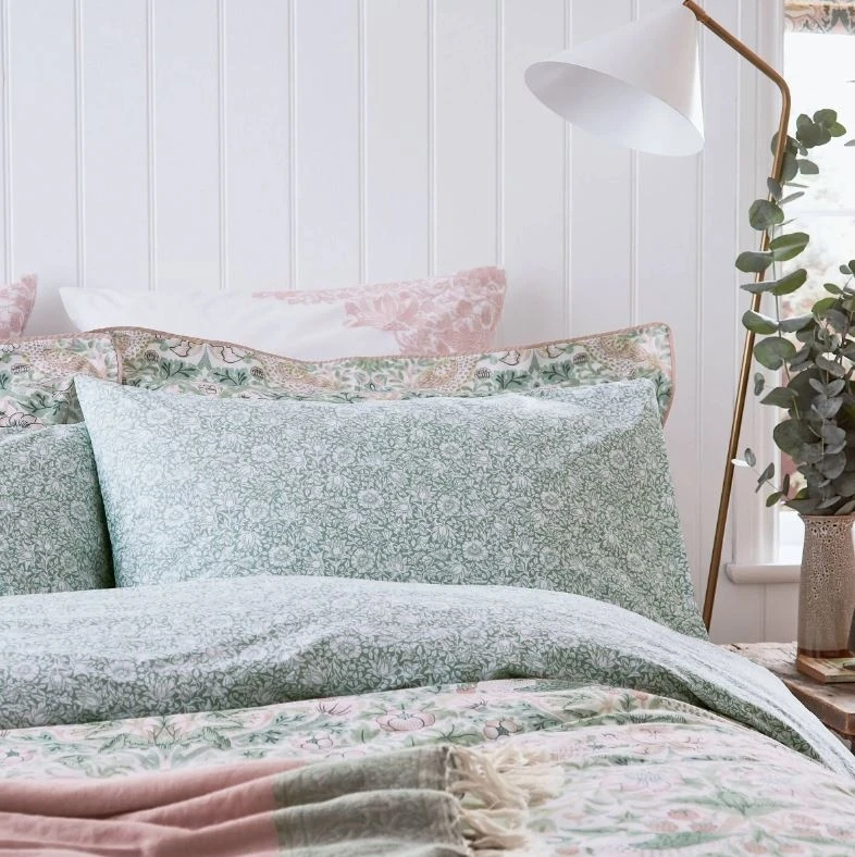 Originally created by William Morris in 1883, the much-loved Strawberry Thief is inspired by thrushes pinching strawberries from his kitchen garden at Kelmscott House. Translated onto bedding in an uplifting colour story, where sage greens pair with crisp pinks in a fresh garden palette.