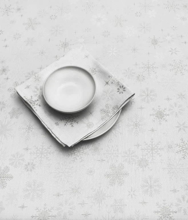Let your table sparkle and shine and impress your guests with this crisp white and metallic jacquard tablecloth featuring an all over snowflake design. Team with luxurious silver accessories to create a glamorous look.